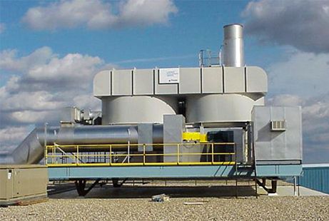 Economic and compact 2-chamber system for low concentrations. The system consists of 2 thermally-separated regenerator chambers. Switching individual chambers between solvent laden and clean air is performed by two poppet valves.